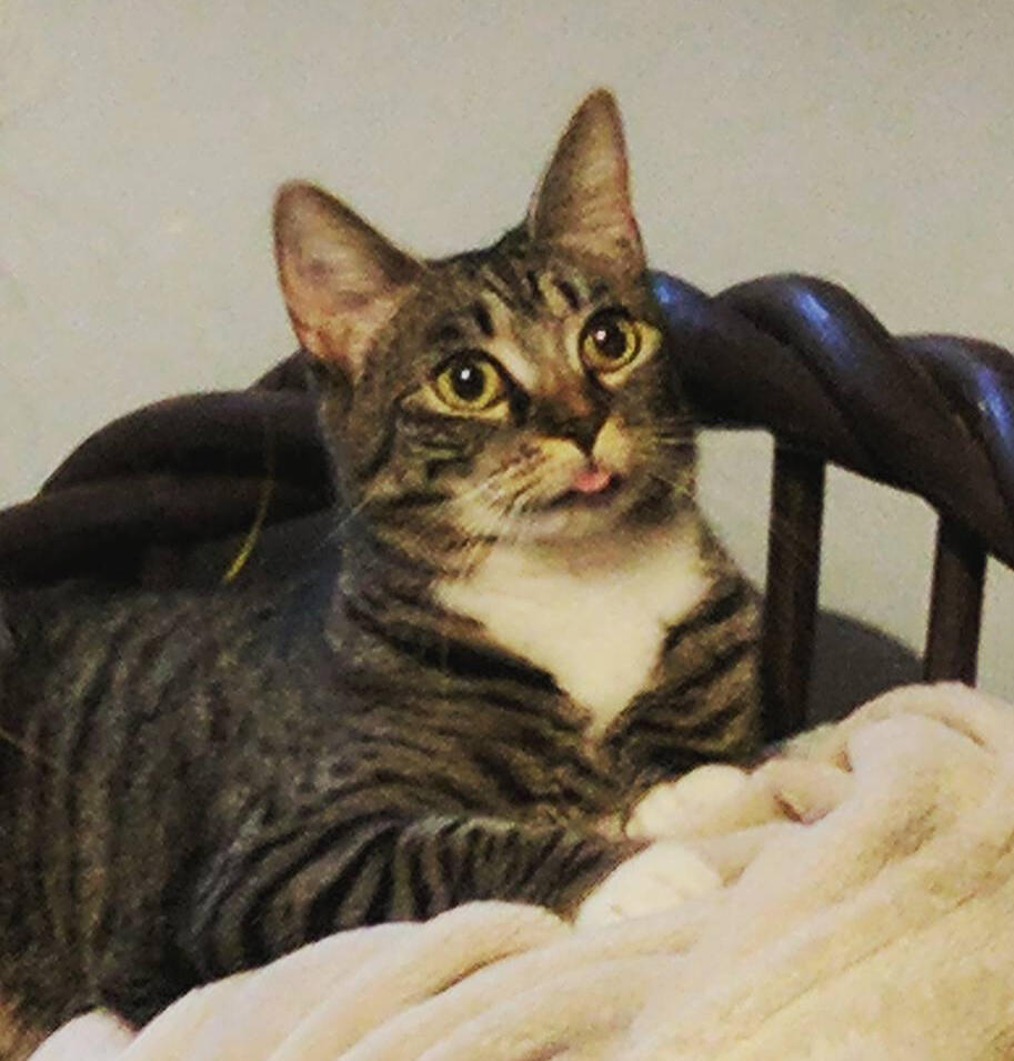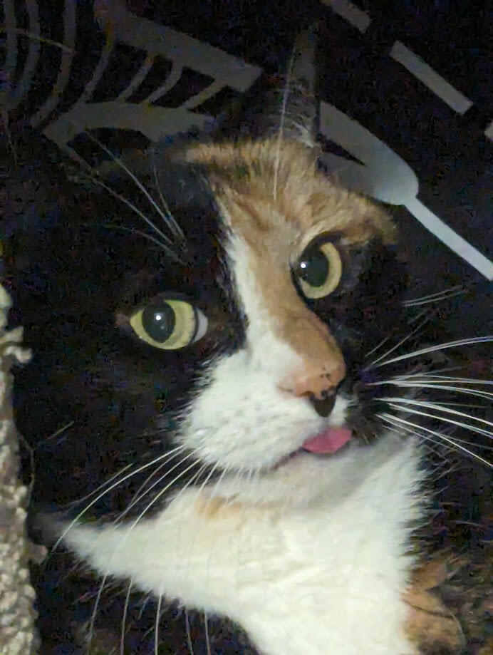 Shadow is a 11 year old spoiled princess calico. She can regularly be found snoozing next to Nico during streams or at the top of the cat tower in the background.